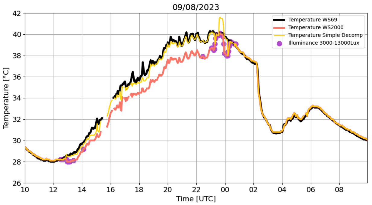 Figure 7. Temperature on 16/07/2023 recorded by TS_1 WS69 (black), WS2000 (red) weather stations. The WS69 is considered as the reference. The Simple Decompensation (yellow) is also shown. Purple dots indicate the period of the day that illuminance is between 3000-13000Lux