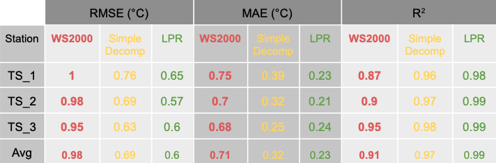 Table 4. Root Mean Squared Error (RMSE), Mean Absolute Error (MAE) and R2 between WS69 temperature and WS2000, Simple Decompensation and LPR temperature for the warm period 05-08/2023 for each of the locations SE_1, SE_2 and SE_3. The average of these locations for these statistical metrics is shown in the row ‘Avg’. The scores in this table have been generated using only rows of data where WS69 temperature was <25.5°C.